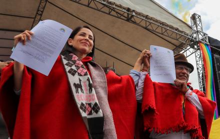 Luisa Gonzáles (RC) y Guillermo Churuchumbi, (Pachakutik) firman acuerdo político.