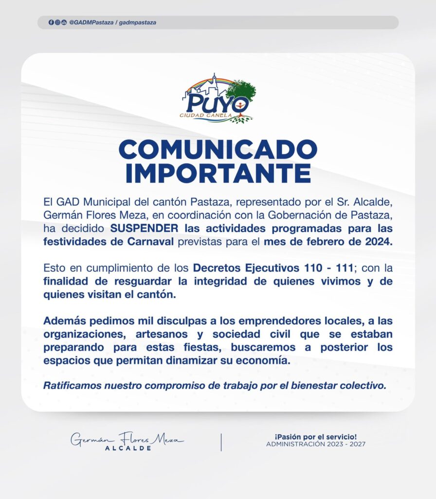 ¡Yo quería bailar en carnaval!….La decisión de no realizar los actos programados con motivo del carnaval 2024, fue tomada en la sesión del Concejo municipal efectuada el 17 de enero del 2024. El argumento es dar estricto cumplimiento a los decretos ejecutivos 110 y 111, con la finalidad de resguardar la integridad de quienes viven en Pastaza y de quienes lo visitan.
