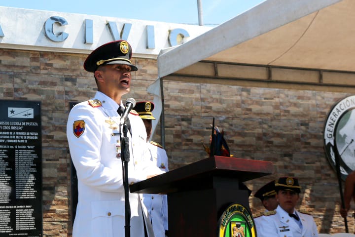 El oficial Chuga, recordó la transformación del emblema nacional; a la vez, recordó los nombres de varios soldados que en determinado tiempo han ofrendado sus vidas y hoy son considerados héroes nacionales.