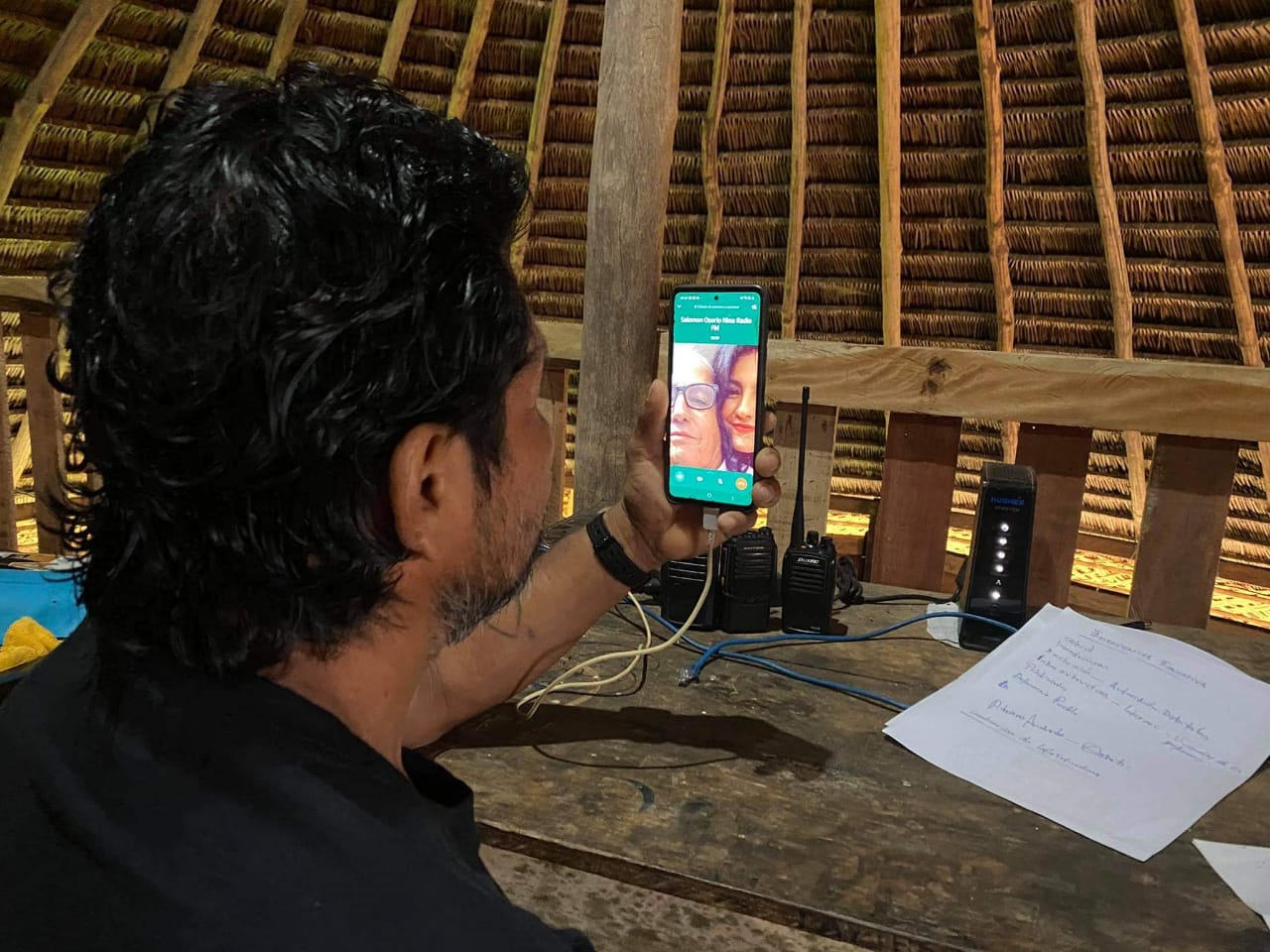 José Santi, dirigente de comunicación de Sarayaku, durante el dialogo que sostuvo esta mañana con Nina Radio «el poder de la verdad» desde Sarayaku