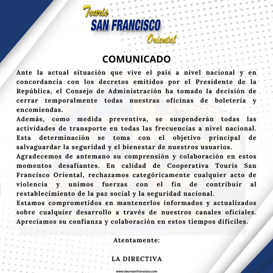 El miércoles, la empresa pionera de transportes en Pastaza, decidió suspender la venta de boletos por cuanto la actividad se vio limitada extremadamente con la medida oficial; sin embargo, luego de diálogos con autoridades provinciales y por la urgencia del país, se decidió para el día de hoy, jueves, reabrir todas las oficinas y atender al público con las restricciones que impone el toque de queda, según informó a Nina Radio, el Presidente de la cooperativa de transportes San Francisco, Remberto López.