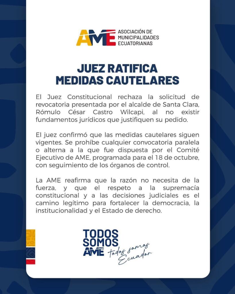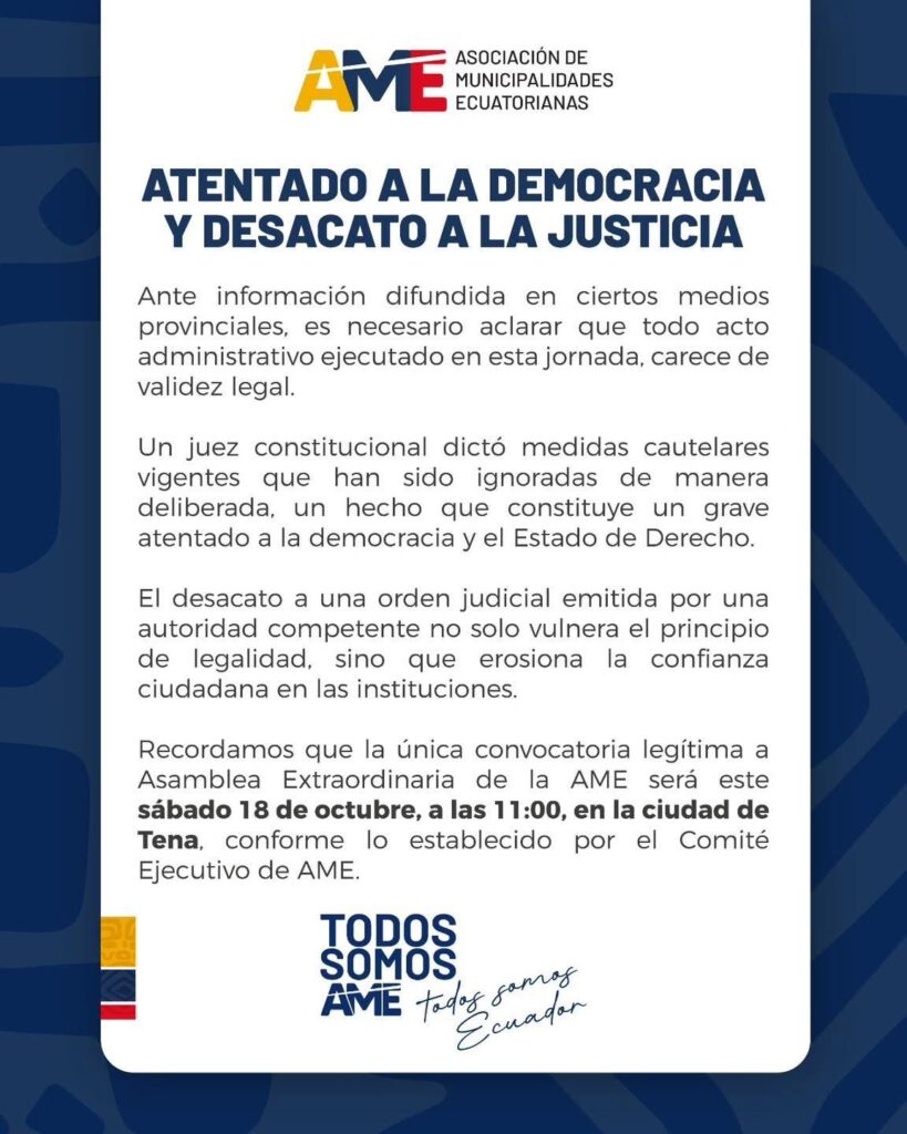 Días atrás un Juez constitucional habría emitido medidas cautelares y que no se debía efectuar ninguna asamblea para el cambio de la directiva. Es más, los mismos que emiten tal documento convocan a una asamblea de AME en la ciudad de Tena el día 18 de octubre, no se conoce el orden del día de la mencionada reunión.. S/U. 16-10-25