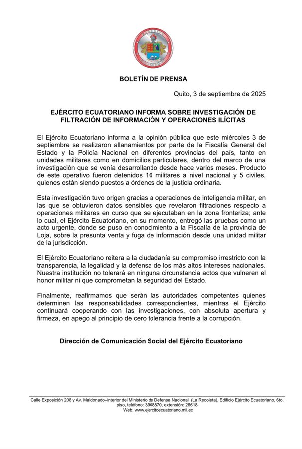 En un comunicado público las Fuerzas Armadas confirmó la detención de los 16 uniformados y anunció que brindarán todas las garantías para las investigaciones pertinentes a los involucrados, advierten que no tolerarán actos delincuenciales al interior de las filas militares.