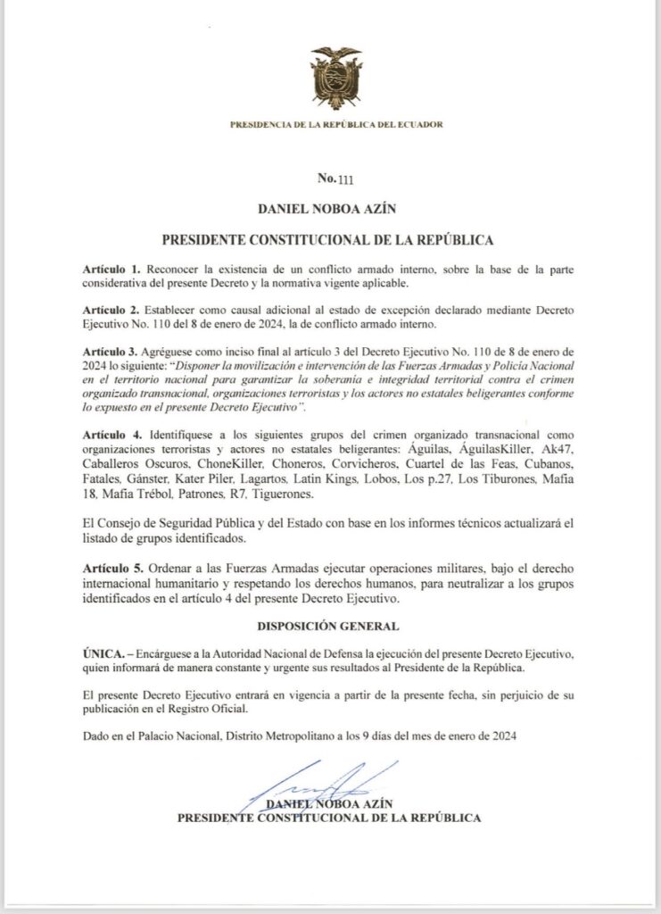 El presidente Daniel Noboa emitió, este 9 de enero de 2024, un decreto ejecutivo el que reforma el estado de excepción vigente y reconoce la existencia de un conflicto armado interno.
